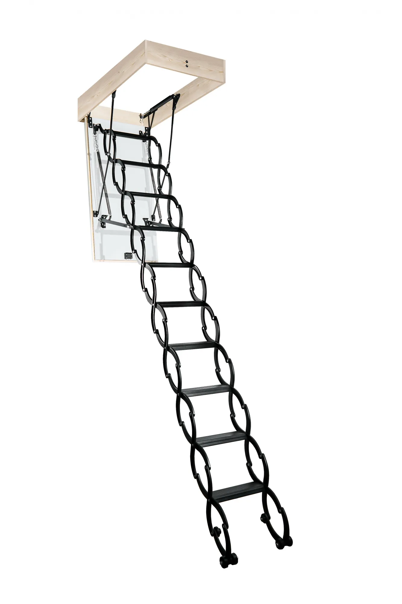 Складная 4-х секционная чердачная лестница. Ступени выполнены из сосны, имеют противоскользящие насечки, направляющие из металла.