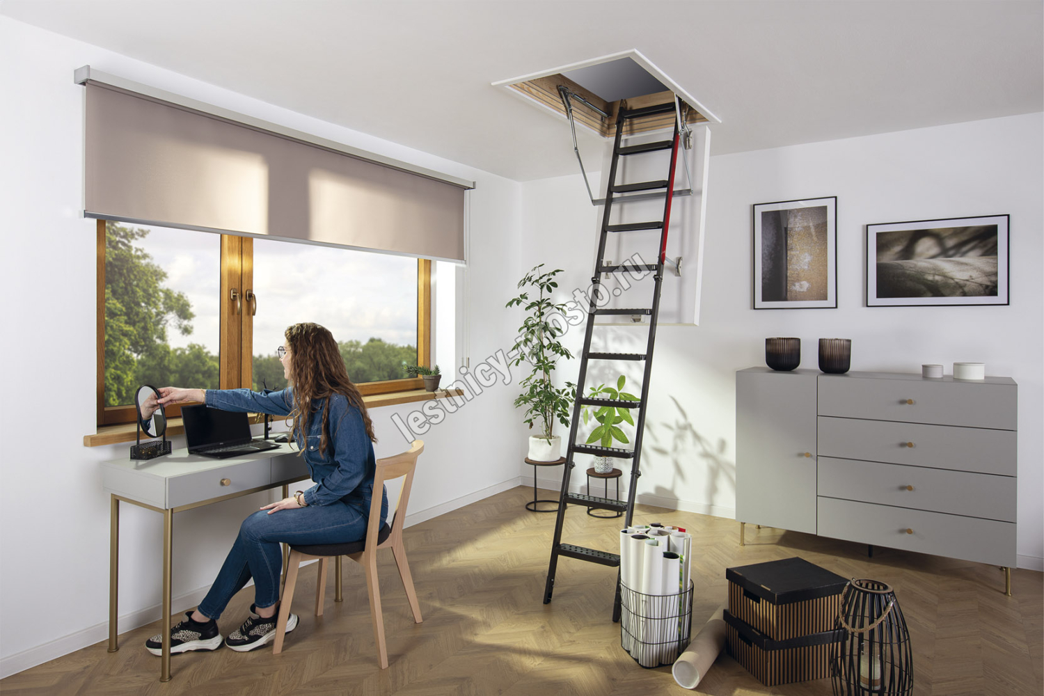 Лестница представляет собой складную конструкцию из металлического лестничного марша и термоизоляционного люка.