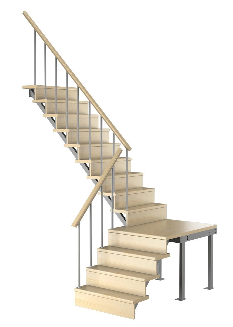 Универсальная лестница, имеющая в основе своей конструкции наклонную опорную балку. Легко впишется в любой интерьер, даже на неровном полу. Место под площадкой можно закрыть и использовать для хранения различных предметов. Монтаж осуществляется силами двух человек на объекте по указаниям, приведенным в паспорте на лестницу.
