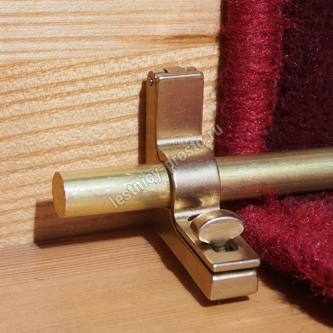 Ковродержатель комплектуется двумя держателями из латуни цвета золото, а также цельным прутком из латуни длиной от 171 до 200 см. Конструкция является сборно-разборной не требующей демонтажа креплений, что делает ее долговечной и очень удобной для чистки ковров и ковровых покрытий.