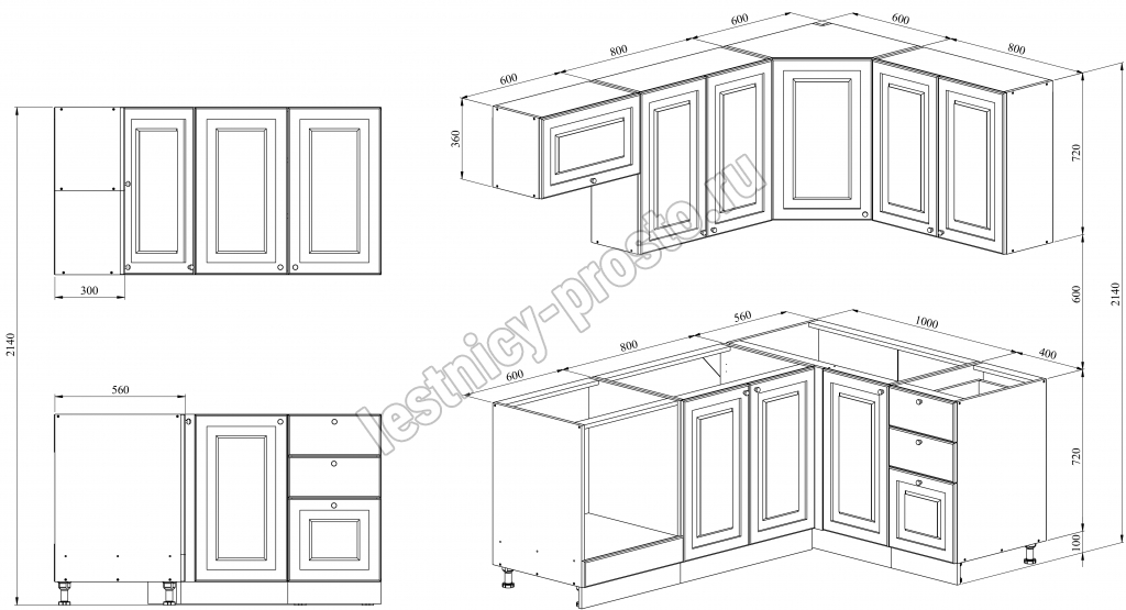 Благодаря модульной системе такая кухня может быть собрана зеркально, а, например, верхние шкафчики "под стекло" и "глухие" заменены местами. В стандартной комплектации нижние тумбы оснащены регулируемыми ножками высотой 100 мм и цоколем из массива сосны 95 мм.