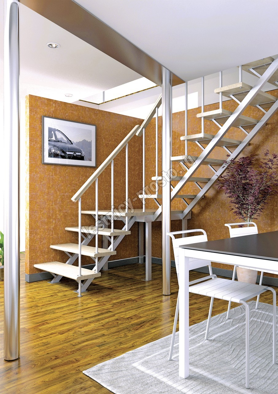 Универсальная лестница на металлическом каркасе с поворотной площадкой. Идеально дополнит любой интерьер, имеет современный вид и удобна в использовании. Монтаж осуществляется силами двух человек на объекте по указаниям, приведенным в паспорте на лестницу.