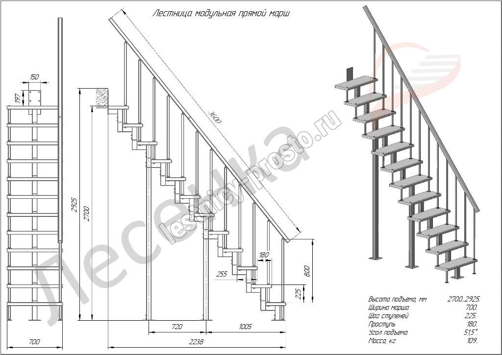 Модульная малогабаритная лестница Линия 2700-2925, Серый, Сосна, Крашеная, Без Ступений