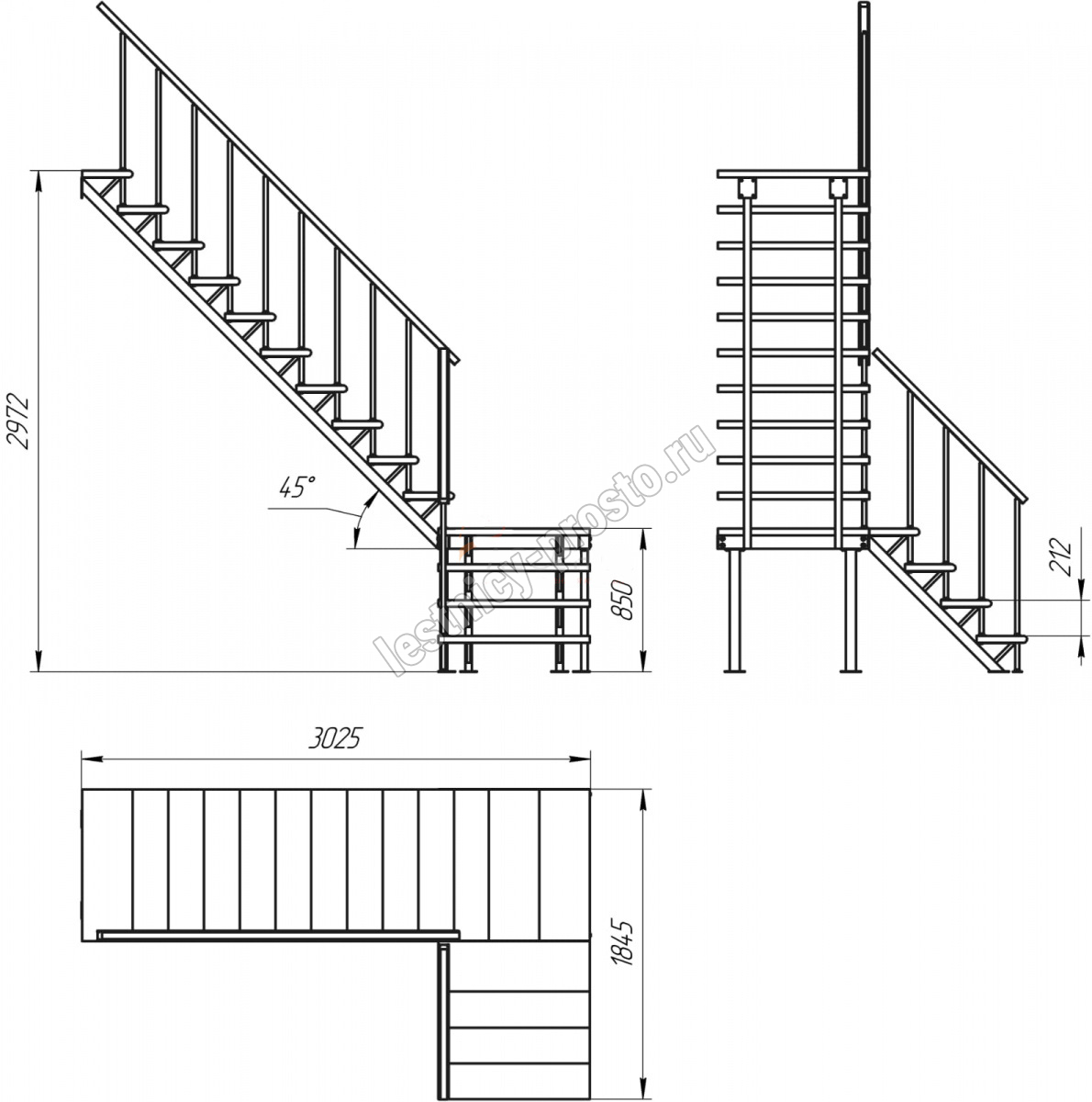 Комбинированная межэтажная лестница ЛЕС-05-3 (поворот 90°, h 3 м), Сосна