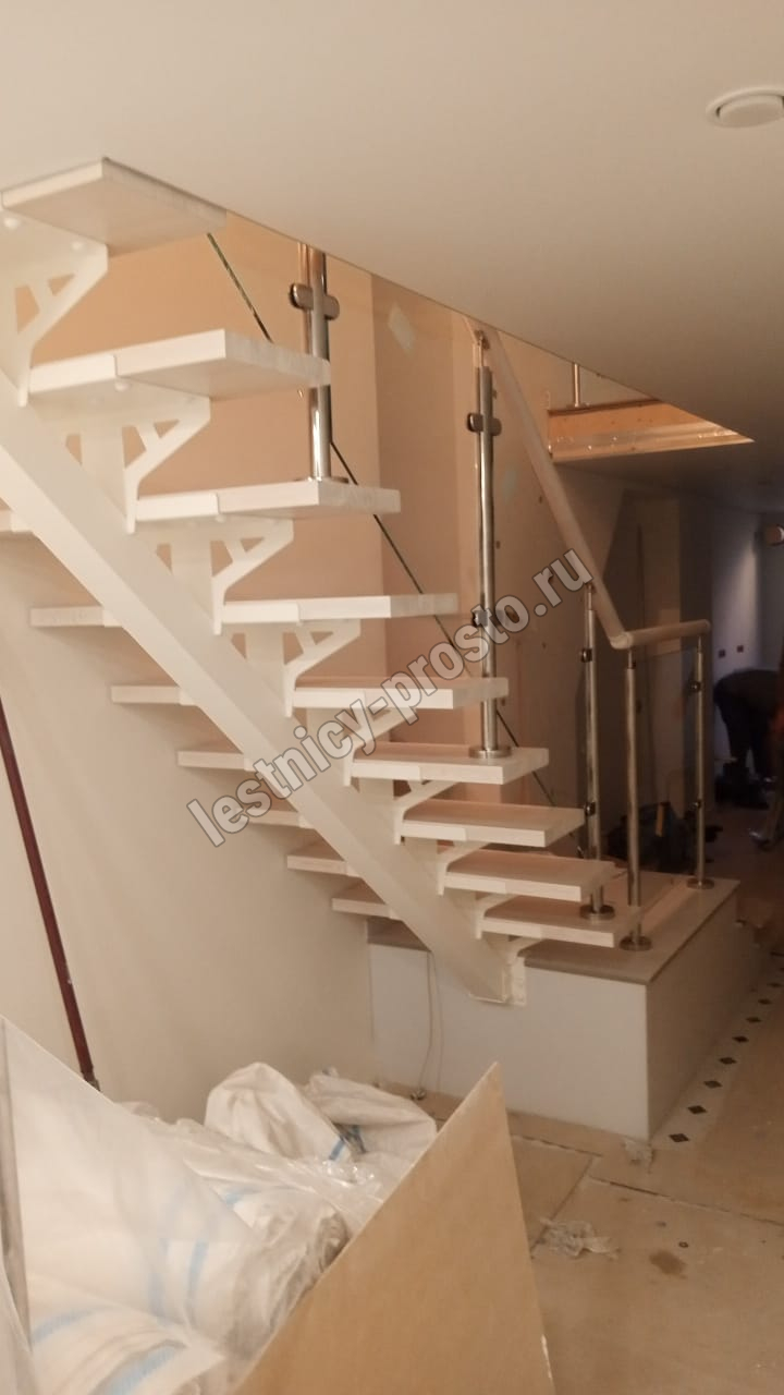 Белая стеклянная лестница на монокаркасе из металла ДМРС-000077