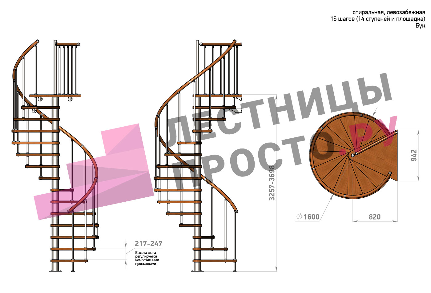 Ширина ступени между центральной колонной и поручнем ≈ 680 мм