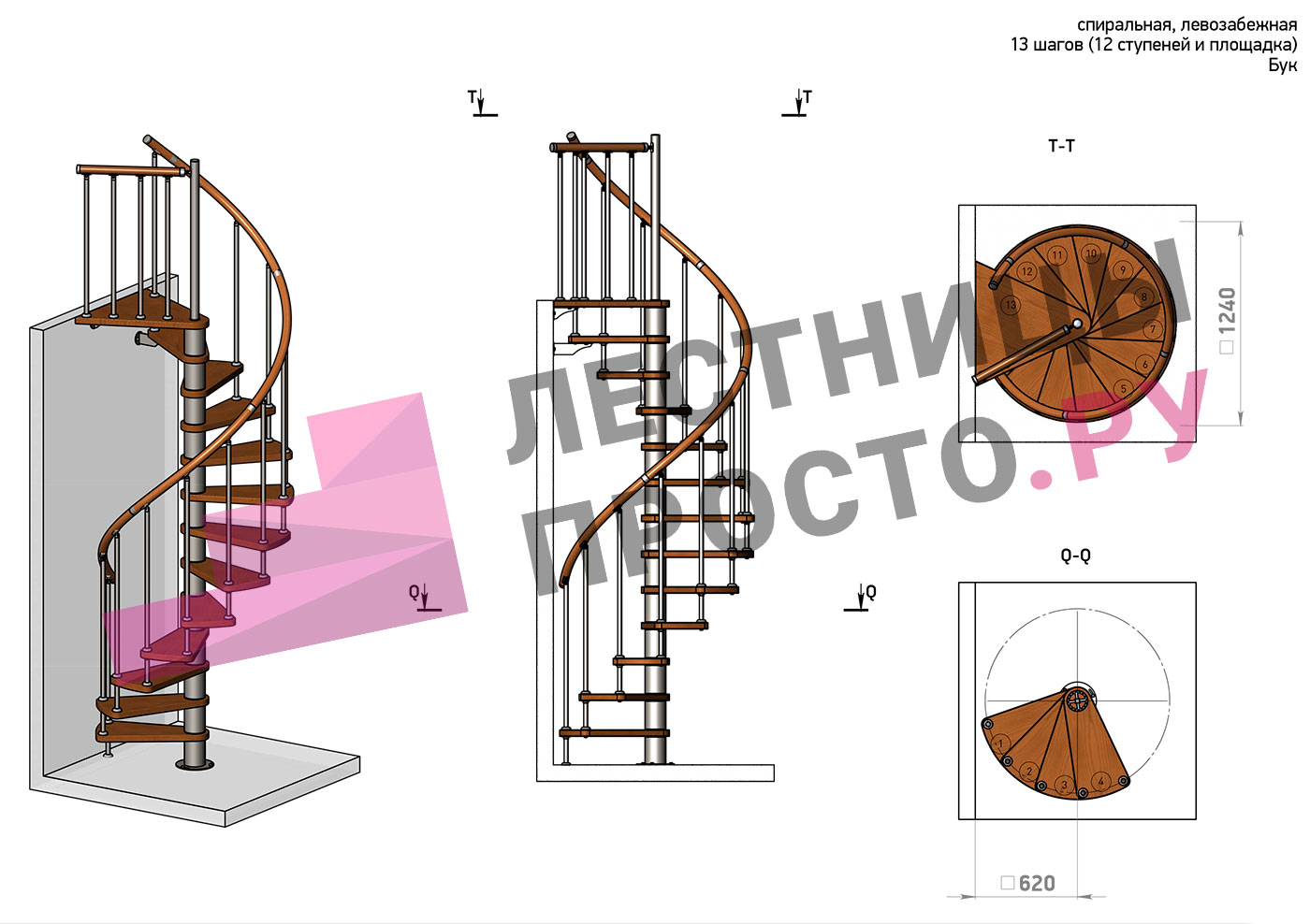 | Винтовая лестница Prosto Spiral Black D140см, h303.9-348,1 см, бук |