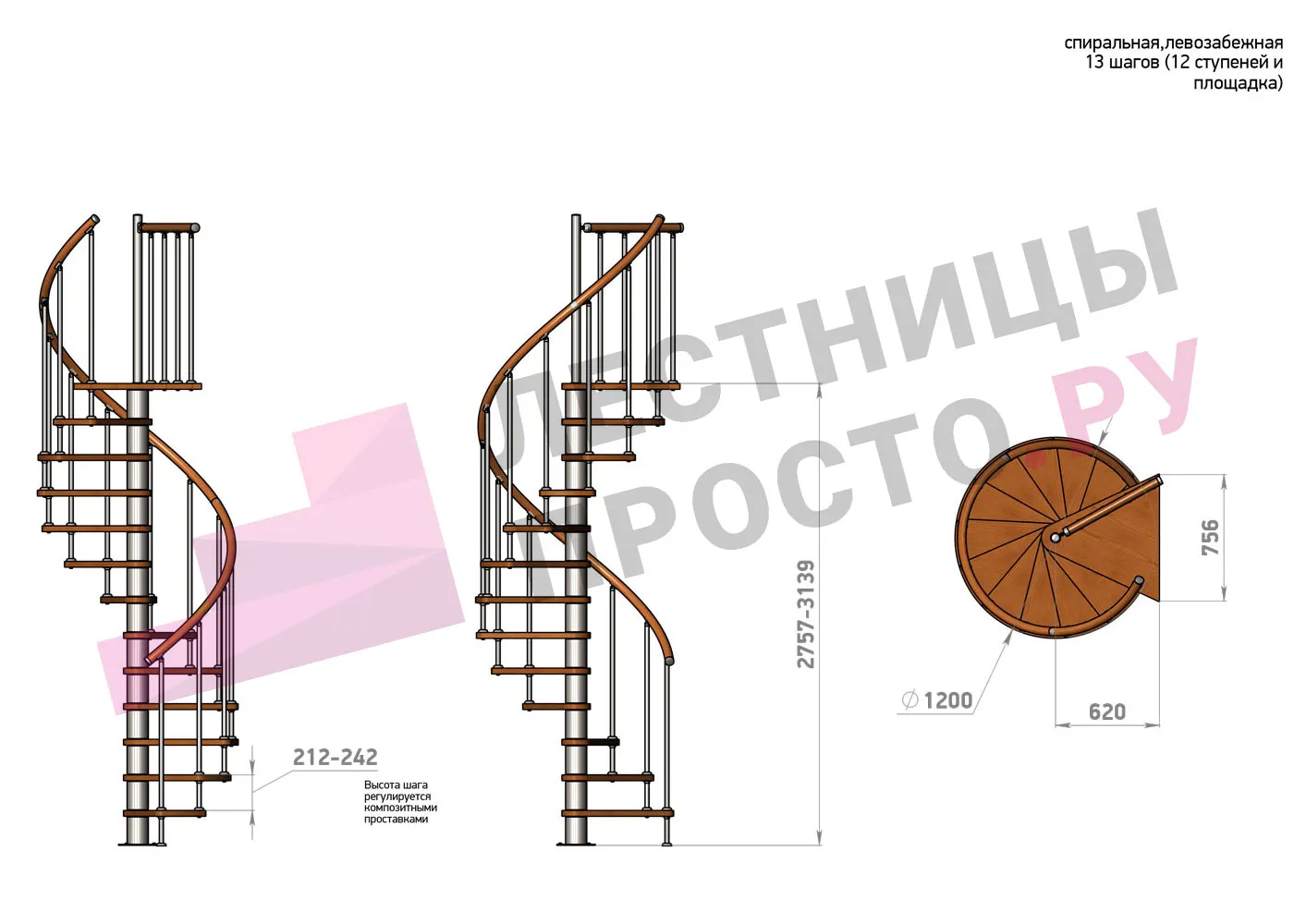 Высота ступеней регулируется с шагом 3 мм. в пределах 212-242 мм., благодаря чему, лестница прекрасно подгоняется под необходимую высоту.