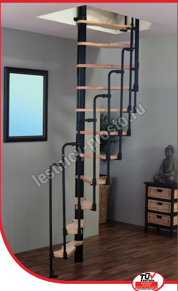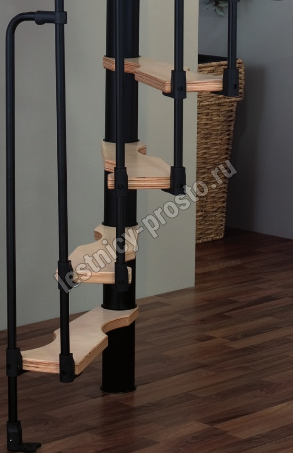 Компактная надёжная лестница. Ступени толщиной 30 мм, изготовлены из массива берёзы по технологии Multiplex, лакированные. Все металлические части оцинкованы горячим способом и покрыты порошковой краской - черного цвета; Лестница имеет надёжную несущую стальную конструкцию.